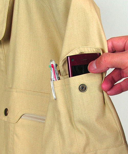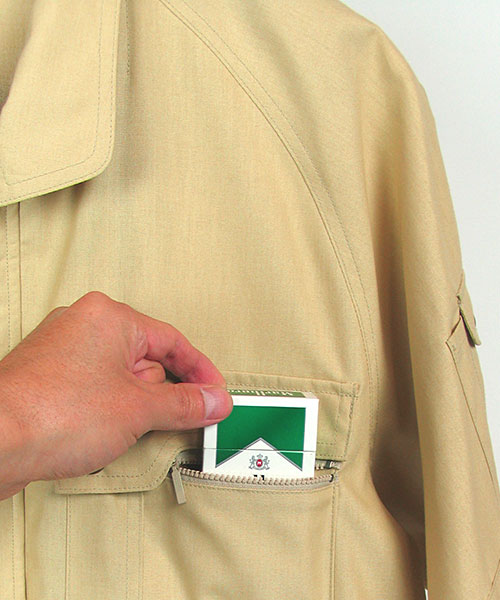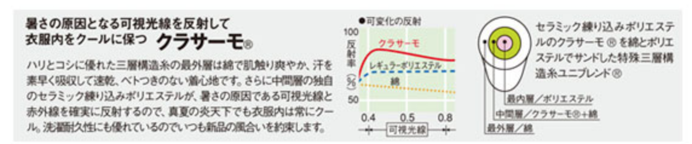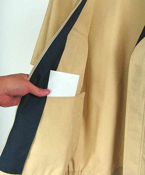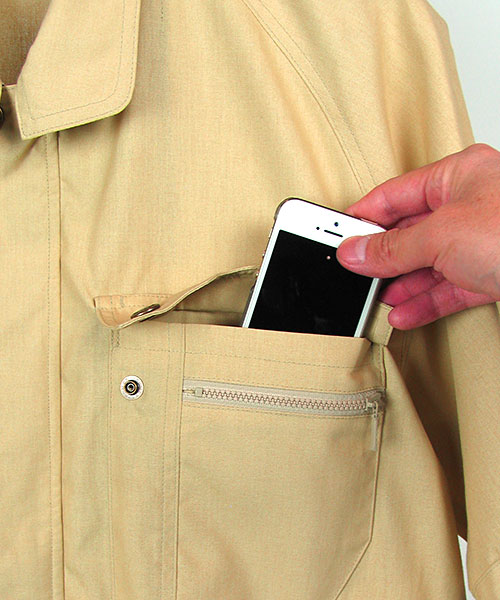 一見普通の作業服のようで、実はハイスペック。 おしゃれ、粋とは派手なものではなく、細かいディテールや見えないところへの気配りだということに改めて気づかされる一着。 シンプルなカラーリングは作業服にありがちだと思われますが良く見ると独特な淡さで涼やかさにも貢献。ファッションデザイナー山本寛斎の感性が光ります。 なんといってもイチバンの特徴はその素材。 特殊な三層構造となっていて、芯のポリエステルにUV加工されたセラミック素材を折込み、その上から綿で包み込んだというハイテクでハイブリッドな高級糸。特殊三層構造UV加工セラミック練り込み素材クラサーモポプリンという長い名前は伊達じゃない! 綿のやわらかな風合いの外観ながら吸汗・速乾性に優れ、暑さの原因紫外線を跳ね返すUVカットというトリプル仕様。 その効果は衣服内の温度が外気より3℃も涼しくなるほど。 クールなデザインで着用感もCool!