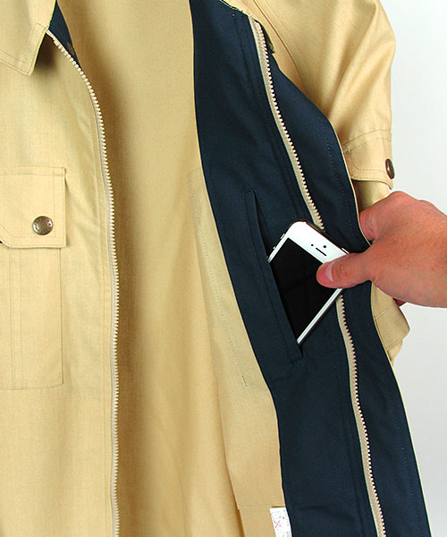 一見普通の作業服のようで、実はハイスペック。 おしゃれ、粋とは派手なものではなく、細かいディテールや見えないところへの気配りだということに改めて気づかされる一着。 シンプルなカラーリングは作業服にありがちだと思われますが良く見ると独特な淡さで涼やかさにも貢献。ファッションデザイナー山本寛斎の感性が光ります。 なんといってもイチバンの特徴はその素材。 特殊な三層構造となっていて、芯のポリエステルにUV加工されたセラミック素材を折込み、その上から綿で包み込んだというハイテクでハイブリッドな高級糸。特殊三層構造UV加工セラミック練り込み素材クラサーモポプリンという長い名前は伊達じゃない! 綿のやわらかな風合いの外観ながら吸汗・速乾性に優れ、暑さの原因紫外線を跳ね返すUVカットというトリプル仕様。 その効果は衣服内の温度が外気より3℃も涼しくなるほど。 クールなデザインで着用感もCool!