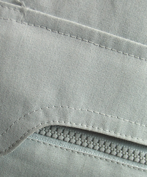 一見普通の作業服のようで、実はハイスペック。 おしゃれ、粋とは派手なものではなく、細かいディテールや見えないところへの気配りだということに改めて気づかされる一着。 シンプルなカラーリングは作業服にありがちだと思われますが良く見ると独特な淡さで涼やかさにも貢献。ファッションデザイナー山本寛斎の感性が光ります。 なんといってもイチバンの特徴はその素材。 特殊な三層構造となっていて、芯のポリエステルにUV加工されたセラミック素材を折込み、その上から綿で包み込んだというハイテクでハイブリッドな高級糸。特殊三層構造UV加工セラミック練り込み素材クラサーモポプリンという長い名前は伊達じゃない! 綿のやわらかな風合いの外観ながら吸汗・速乾性に優れ、暑さの原因紫外線を跳ね返すUVカットというトリプル仕様。 その効果は衣服内の温度が外気より3℃も涼しくなるほど。 クールなデザインで着用感もCool!