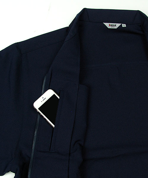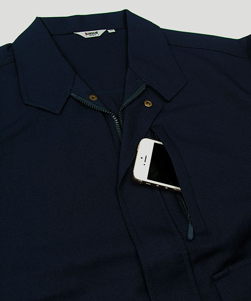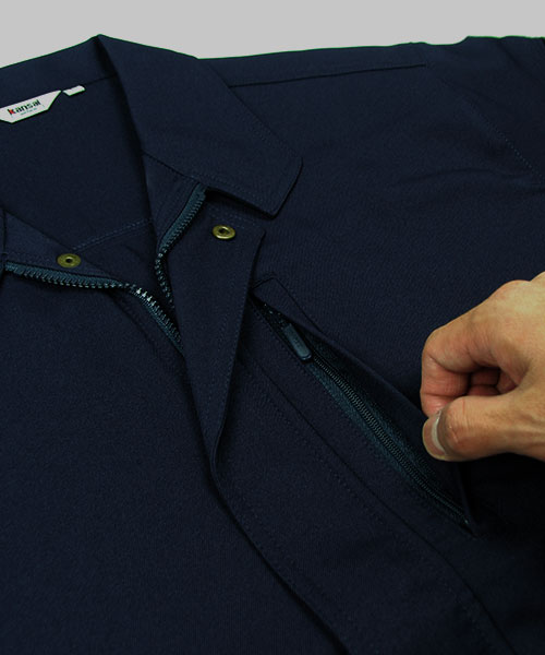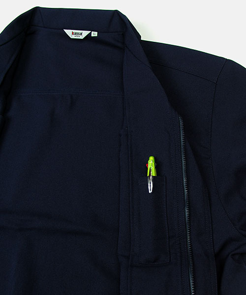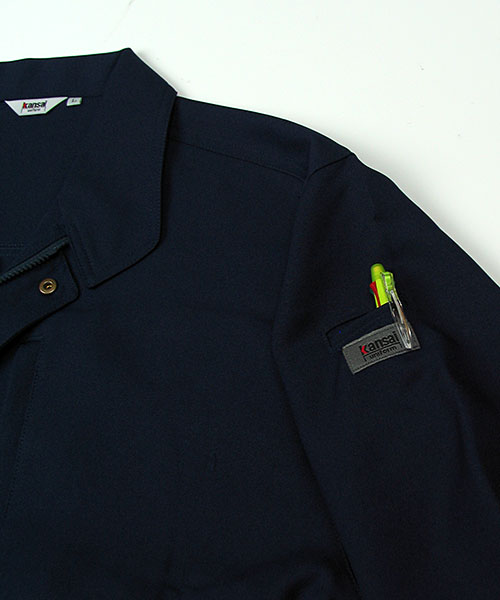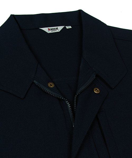 ダブルカフスユニフォームにも個性が欲しい。もっとオシャレに着こなしたい。 そんな願いから生まれた山本寛斎デザインユニフォーム。 k3091はファッションブランドとして築き上げた感性そのままのスタイリッシュな作業服。 ぱっと目を引くその色やシルエットはさながらデニムジャケットの様であり、 スマートに仕事の出来る大人のオトコを演出します。 ちょっとワイルドなニュアンスをサラリと着こなしてサマになるという点で、 Gジャンという言葉に馴染みのある世代もかっこよく羽織れるのが特徴。 シンプルなデザインを引き立たせる真鍮製ボタンもさり気なくてポイントアップ。 外見だけでなく性能面もデキる作業着!上側、横側両方から収納できるポケットは実は業界No.1クラスの収納力を誇る大型ポケット。 これを胸でなく脇に配置することにより、たっぷり収納しても身体のバランスが崩れません。 また、ストレッチ素材を使用していることでも動きやすく作業がスムーズに。 Kansaiのユニフォームへの美学が光る、デキるオトコの近道。