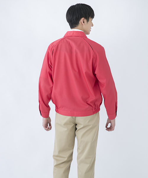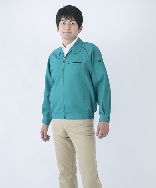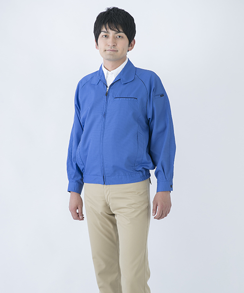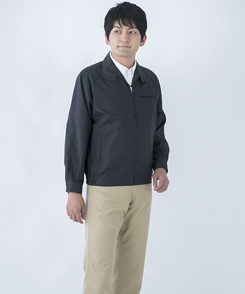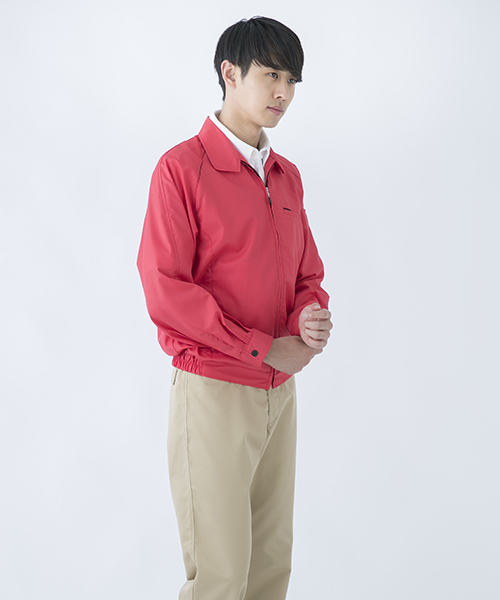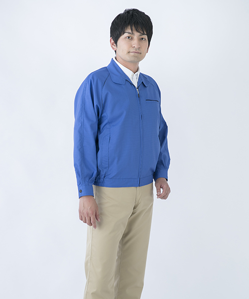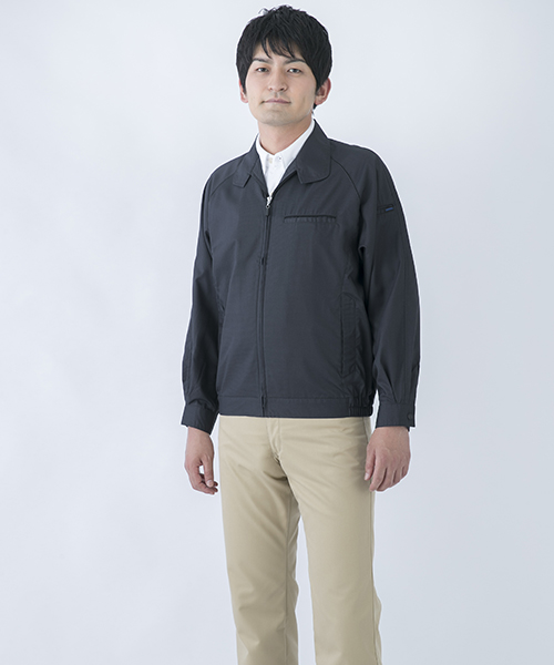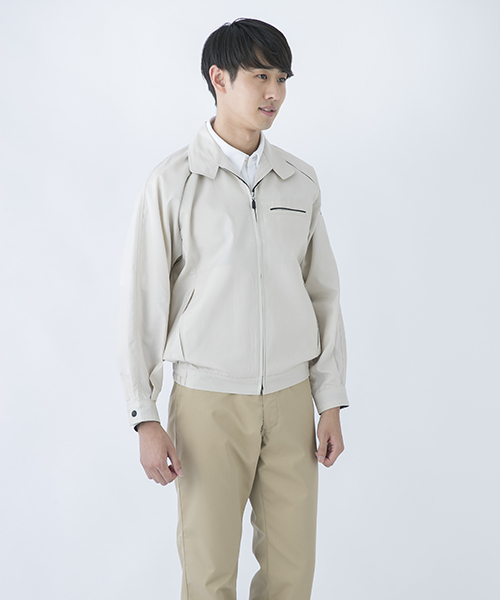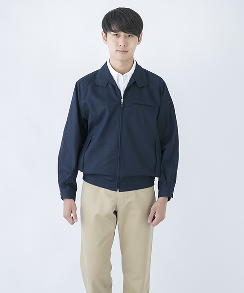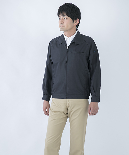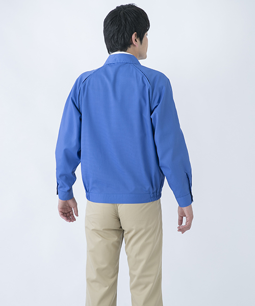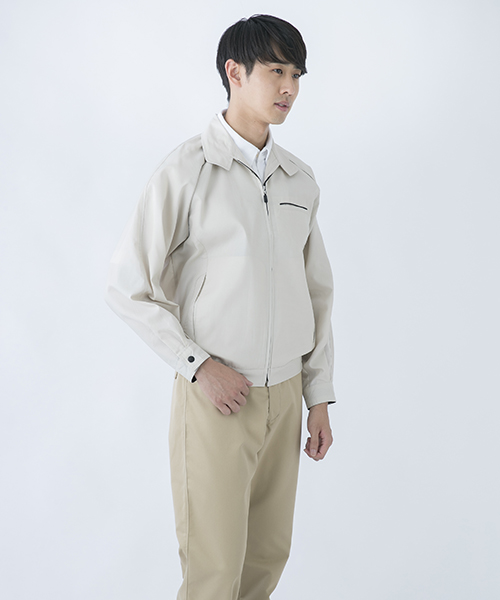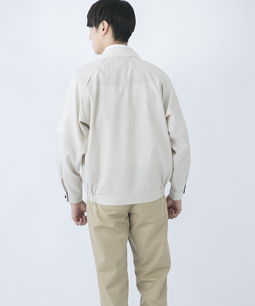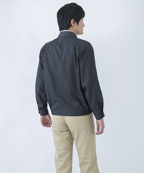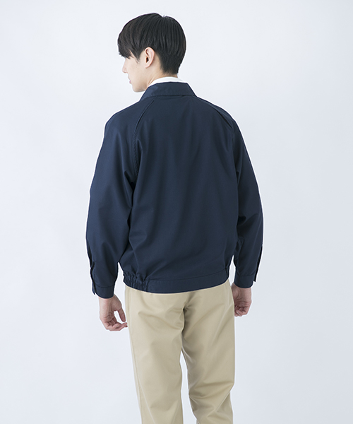 ポリエステル・ナイロンブルゾン特有の「シャカシャカ音」がせず、1年中着用できるブルゾンをコンセプトに企画開発した商品です。使用しているシキボウ日本製素材は、細い糸と太い糸を組み合わせた校倉織りにより独特の表面感を持ち、高級感があります。また、ラグラン袖をさらに動きやすく改良した「D-ラグ」などの細部にまでこだわった仕様と、カフス裏の配色やウレタン素材の引き手など、遊び心あふれるデザインは、接客中のお客様の緊張感もときほぐし、好印象。当社制服にも採用しています。〔シキボウ 日本製素材使用〕