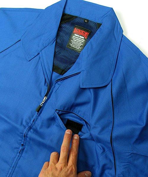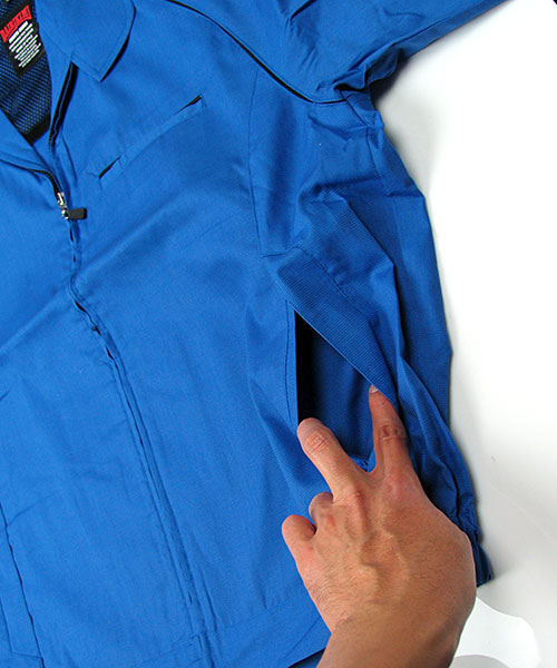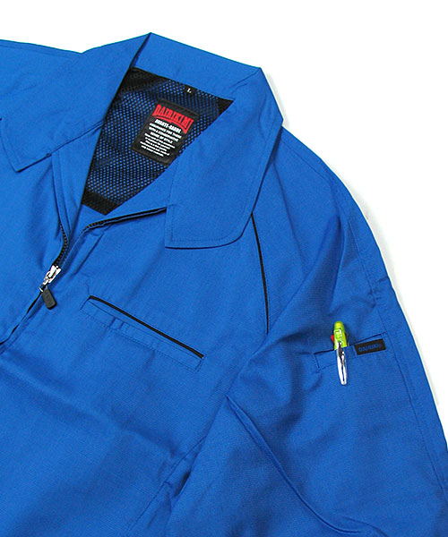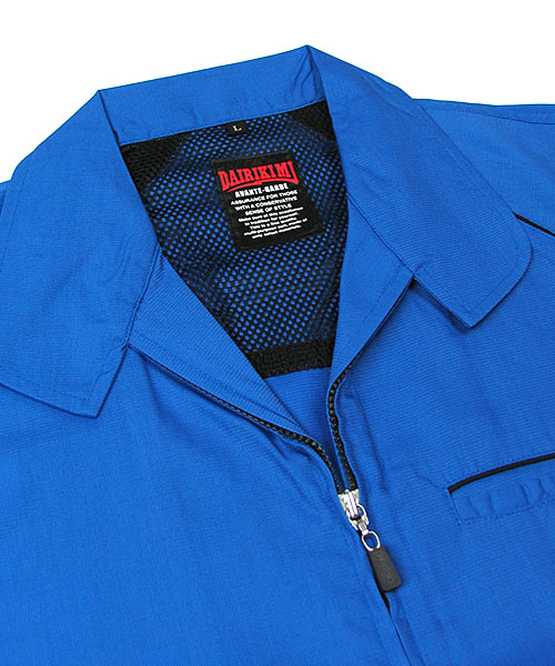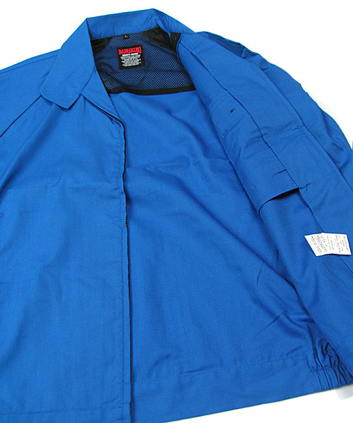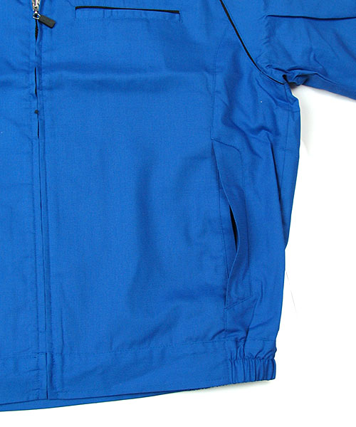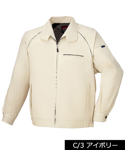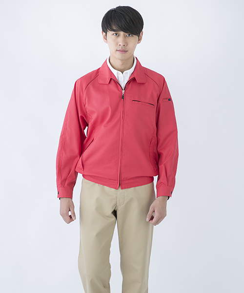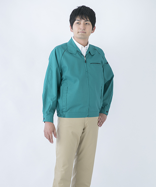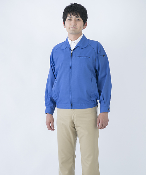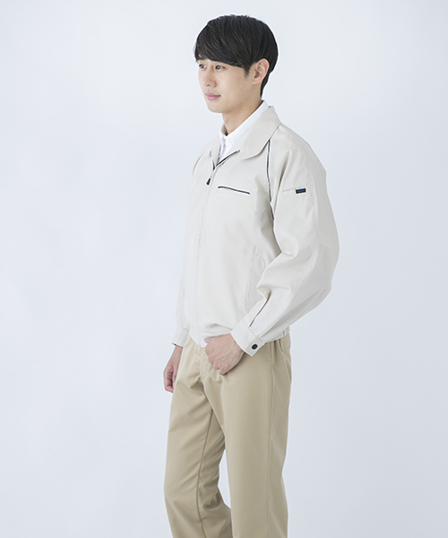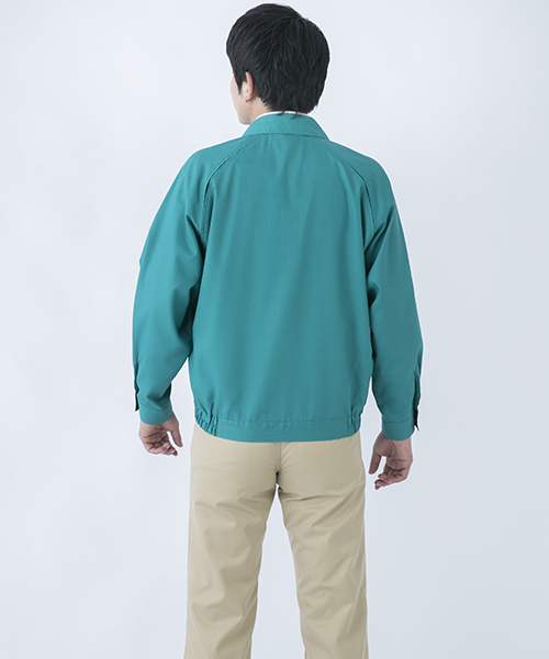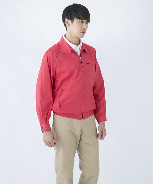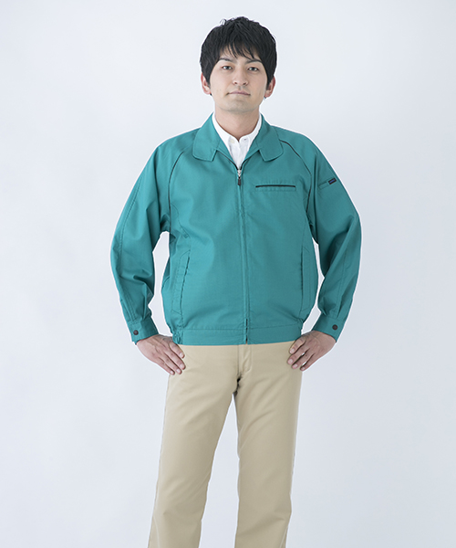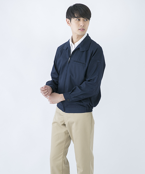 ポリエステル・ナイロンブルゾン特有の「シャカシャカ音」がせず、1年中着用できるブルゾンをコンセプトに企画開発した商品です。使用しているシキボウ日本製素材は、細い糸と太い糸を組み合わせた校倉織りにより独特の表面感を持ち、高級感があります。また、ラグラン袖をさらに動きやすく改良した「D-ラグ」などの細部にまでこだわった仕様と、カフス裏の配色やウレタン素材の引き手など、遊び心あふれるデザインは、接客中のお客様の緊張感もときほぐし、好印象。当社制服にも採用しています。〔シキボウ 日本製素材使用〕