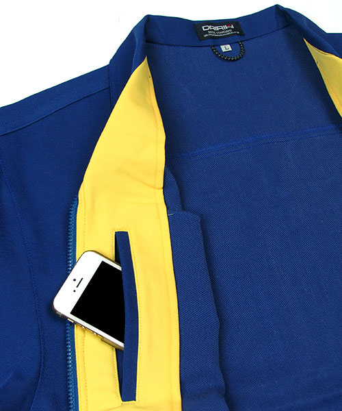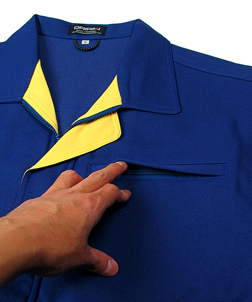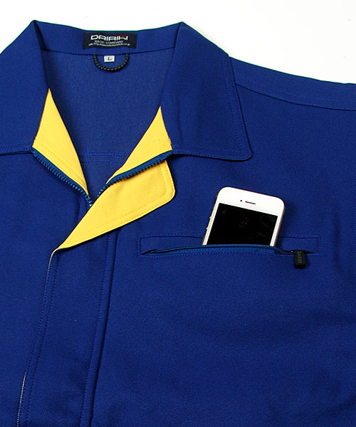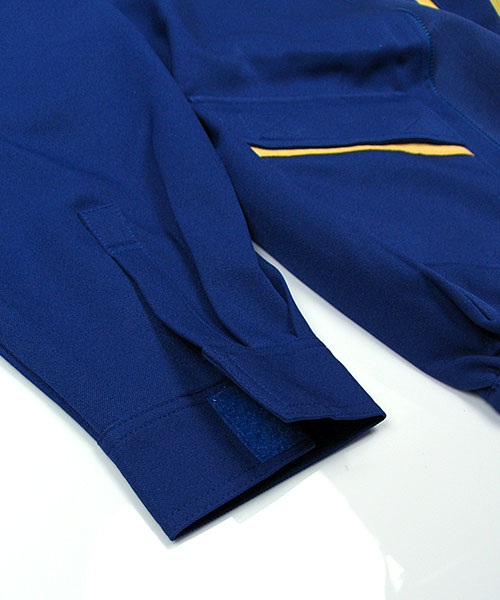 接客・配送をはじめ、バックヤードで力仕事をされる方々に向けて企画された商品です。運んでいる商品を傷つけないよう、金属ボタンを袖口・前立て下に隠し、働きやすさを追求しています。また、大量の収納物が入るよう、ポケットは胸ではなく脇に配置することで、いっぱいに入れたときでも違和感がなく、出し入れが目で確認できるためスムーズです。ポケット下の配色がシャープでスピーディーな印象を与えてくれます。 [東レ 日本製素材使用]