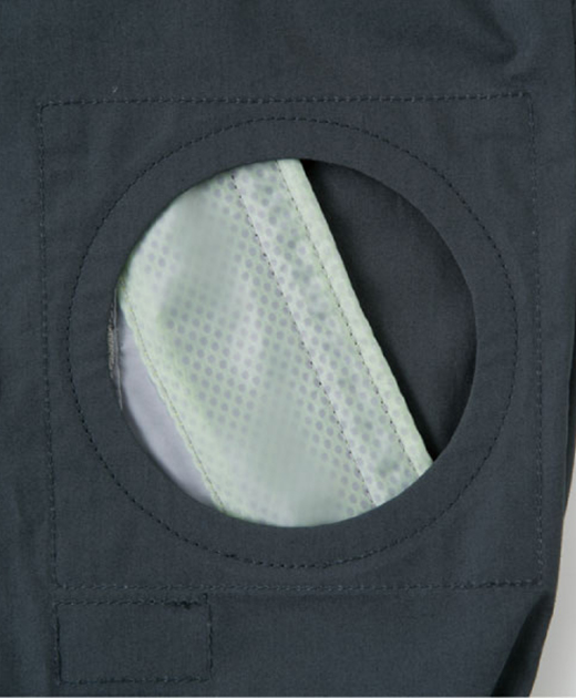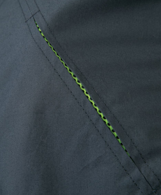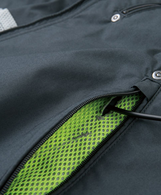 胸や袖・両脇ポケットのメッシュ部分に、さりげなく蛍光イエローを配色。