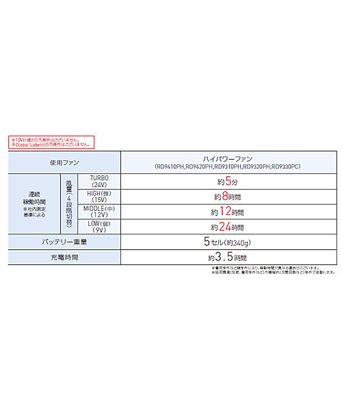 最大で24Vの出力が可能なRD9590PJは、Sマーク認証の取得・日本の電気用品安全法(PSE法)の基準に適合しているため、安全に使用できる業界唯一の日本製バッテリーです。