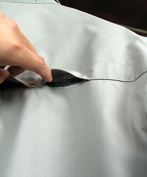 DAIRIKIブランドの”No.1″ウェアをコンセプトに開発され名付けられたD1(ディーワン)シリーズの夏バージョン。もともと動きやすいラグラン袖をさらに動きやすくするために、伸縮メッシュでつなぎ合わせることで、究極の動きやすさと涼しさを実現。このメッシュ結合部分を2mmだけアクセントとして見せて肩カーブを縫製できるのは、当社ならではの高い技術があればこそ。他社にはまねできない自信の商品です。また、素材は細い糸と太い糸を組み合わせる校倉織りにより、独特の表面感で高級感があり、通気性にもすぐれています。